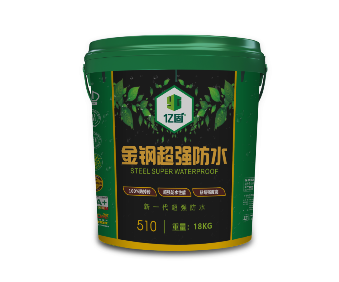 亿固510金钢超强防水灰浆是一种双组份、丙烯酸类高聚物改性新水泥基防水涂料,高效提升了产品早期强度,不易开裂,加快了施工时间;本品能有效的阻止渗漏,广泛适用于地下室、屋顶、厨房、卫生间、阳台等贴砖前的防水处理。本品具有超强的粘结强度,增强基层与粘贴层的粘结力、不空鼓、不脱落、长效防水。